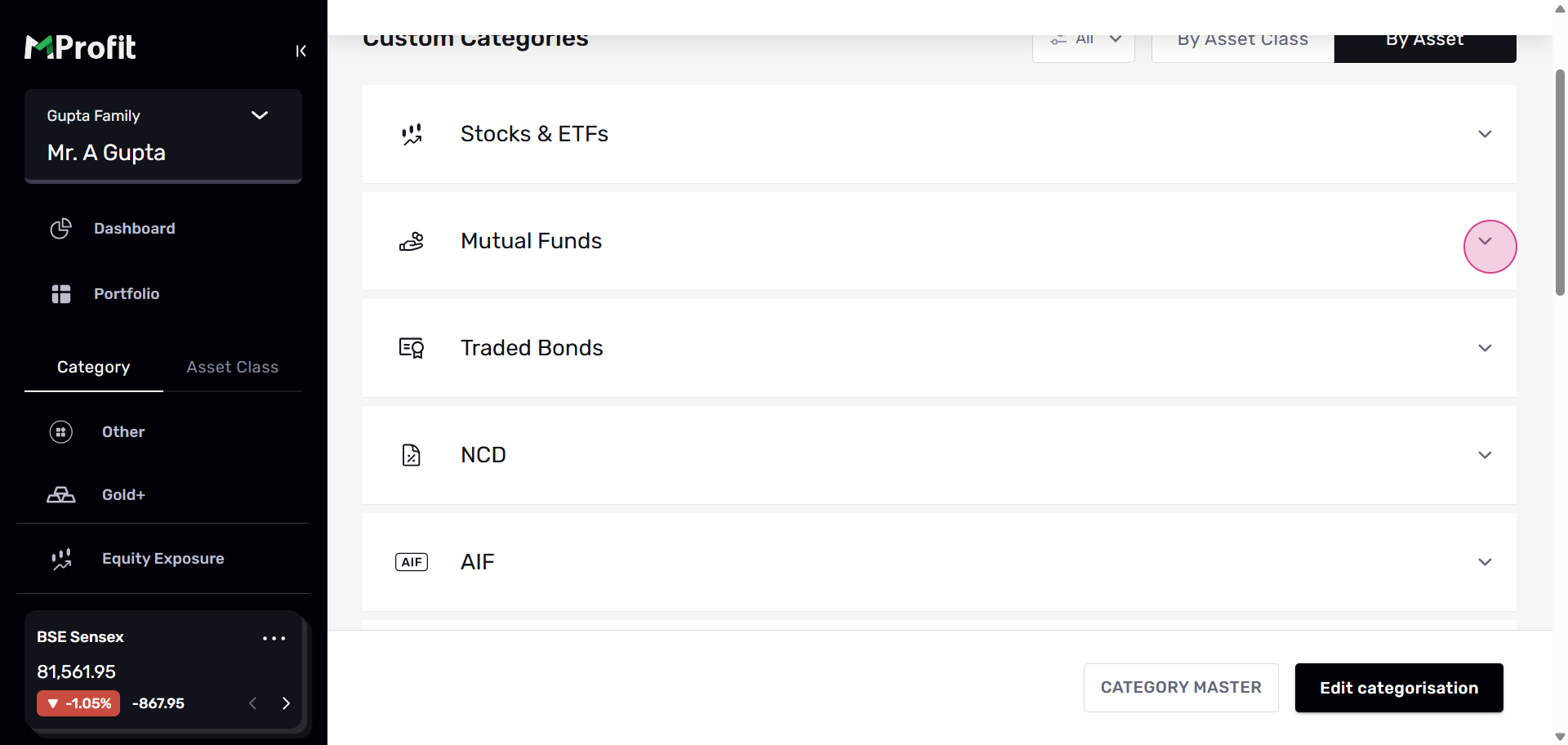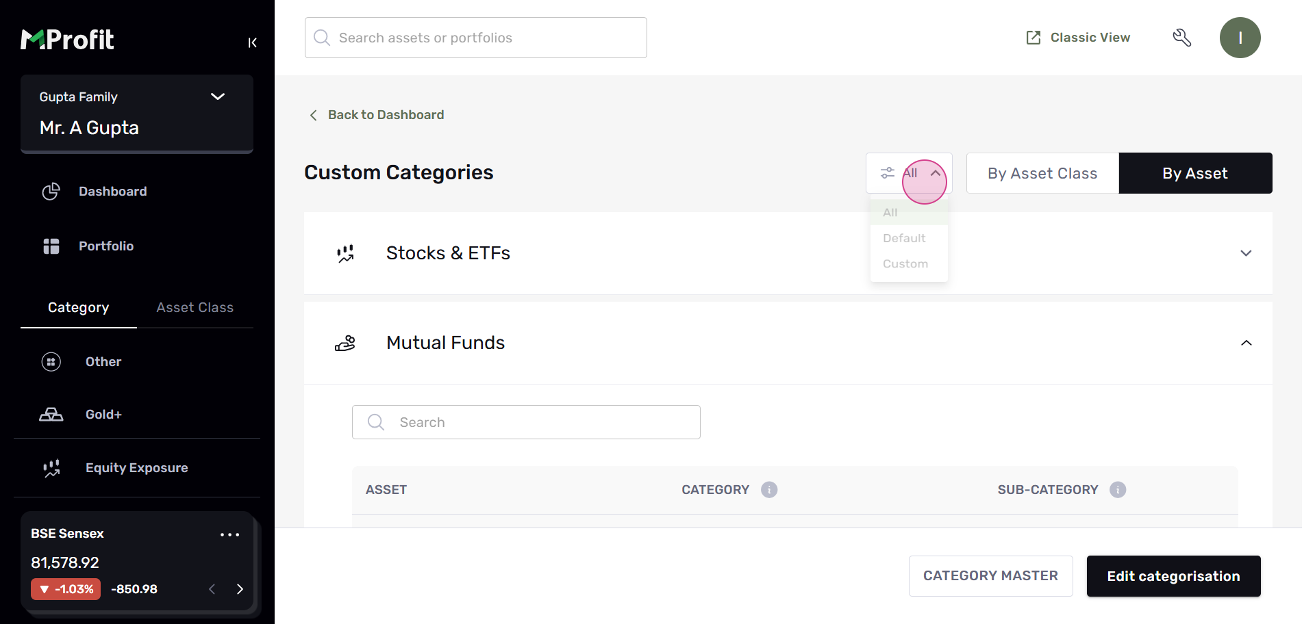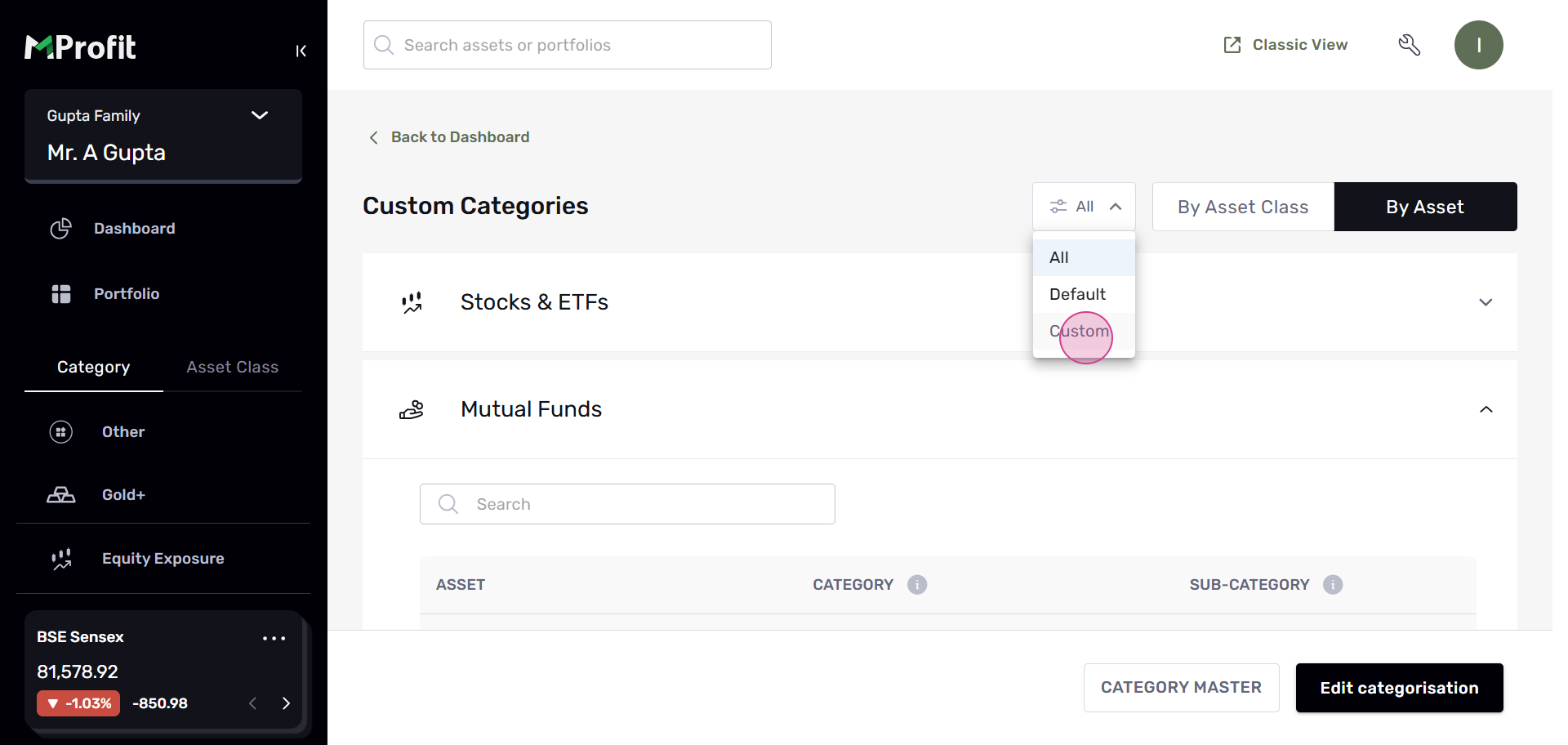 Step 15: You'll see the changes reflected in your portfolio. This change will be visible across all portfolios and families. At the top, you'll find a filter that displays the default or custom categorizations you've made.