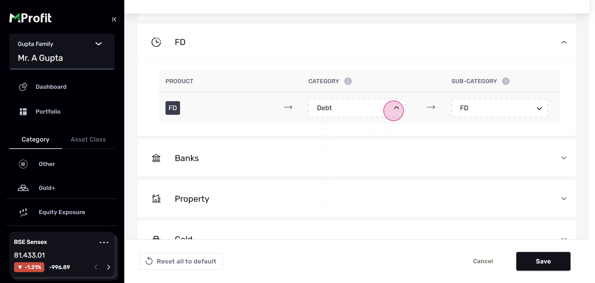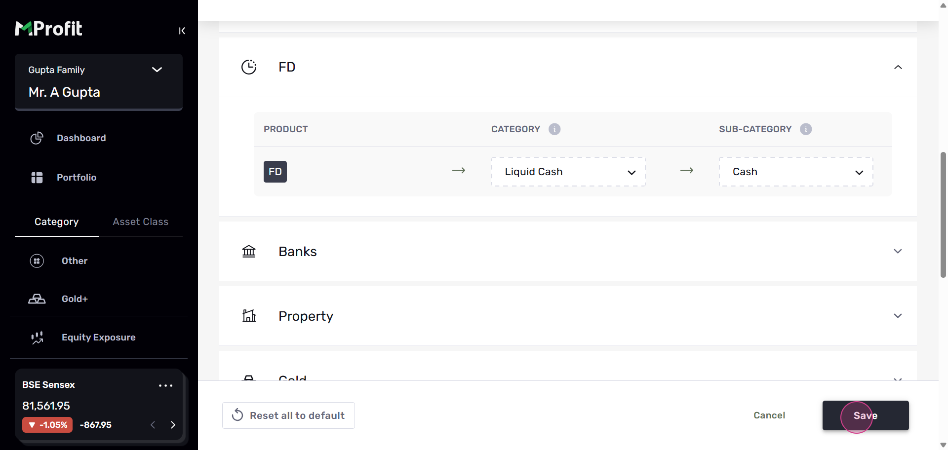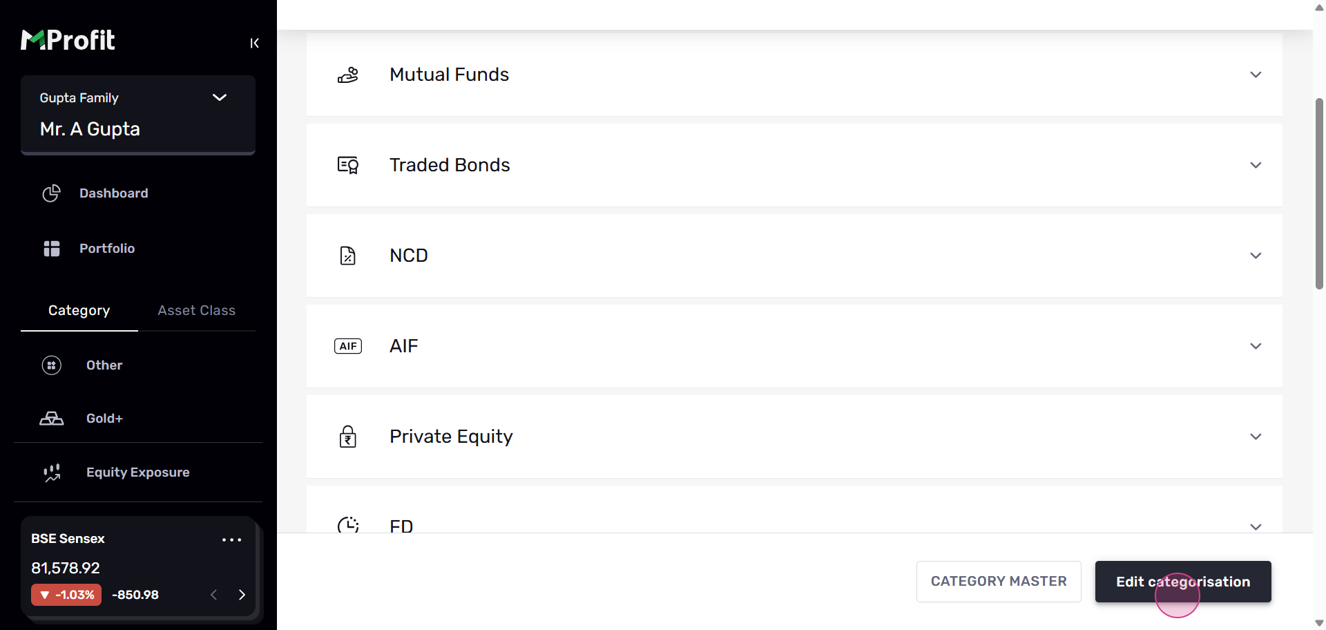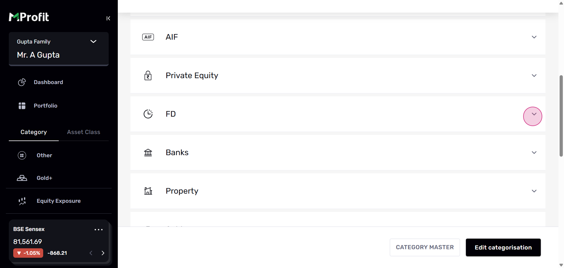 Step 4: In the Custom Categories section, you'll see assets categorized by Asset Class and by Asset. Let's use FD as an example.