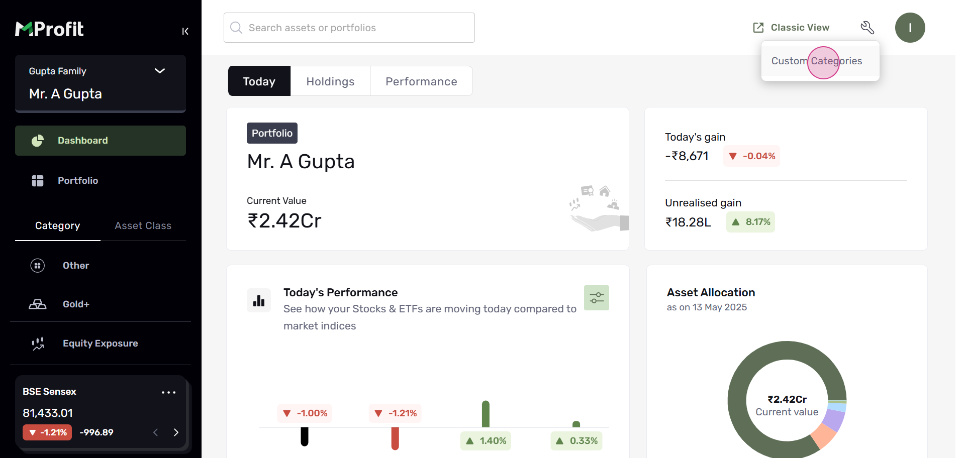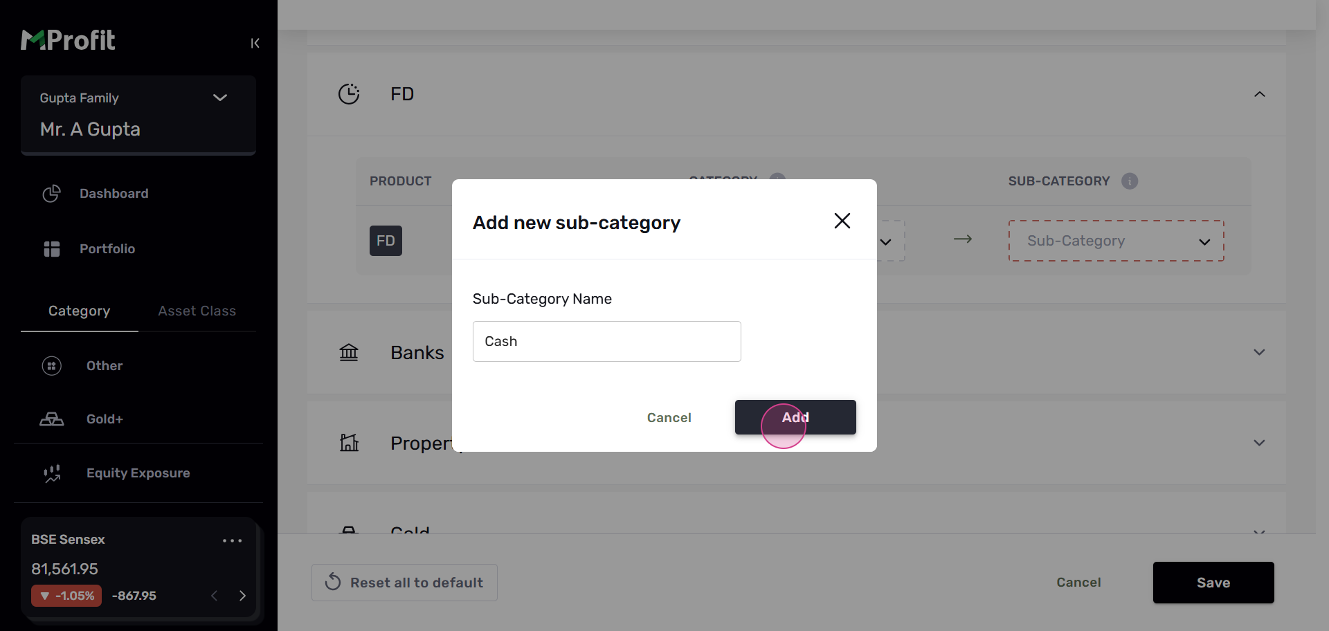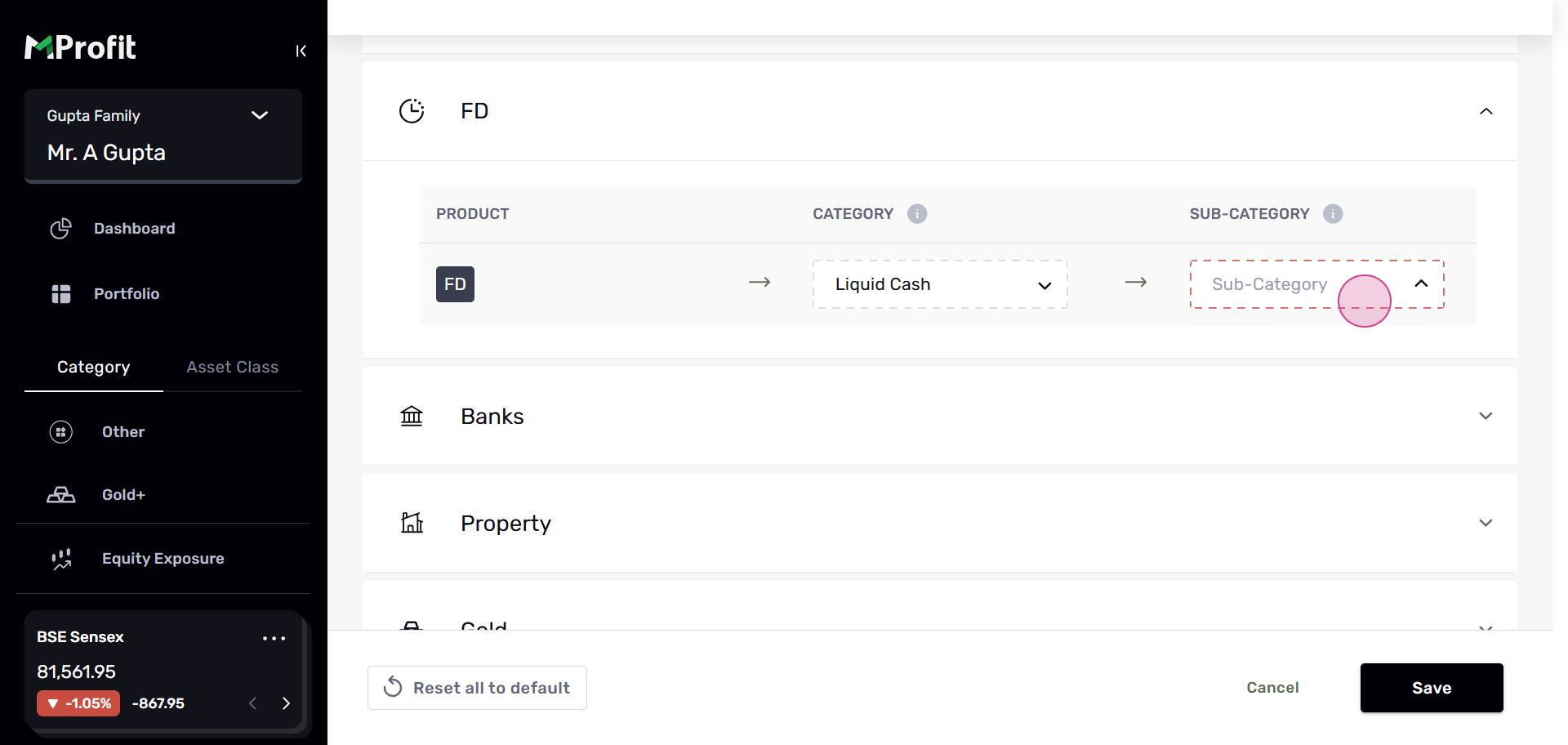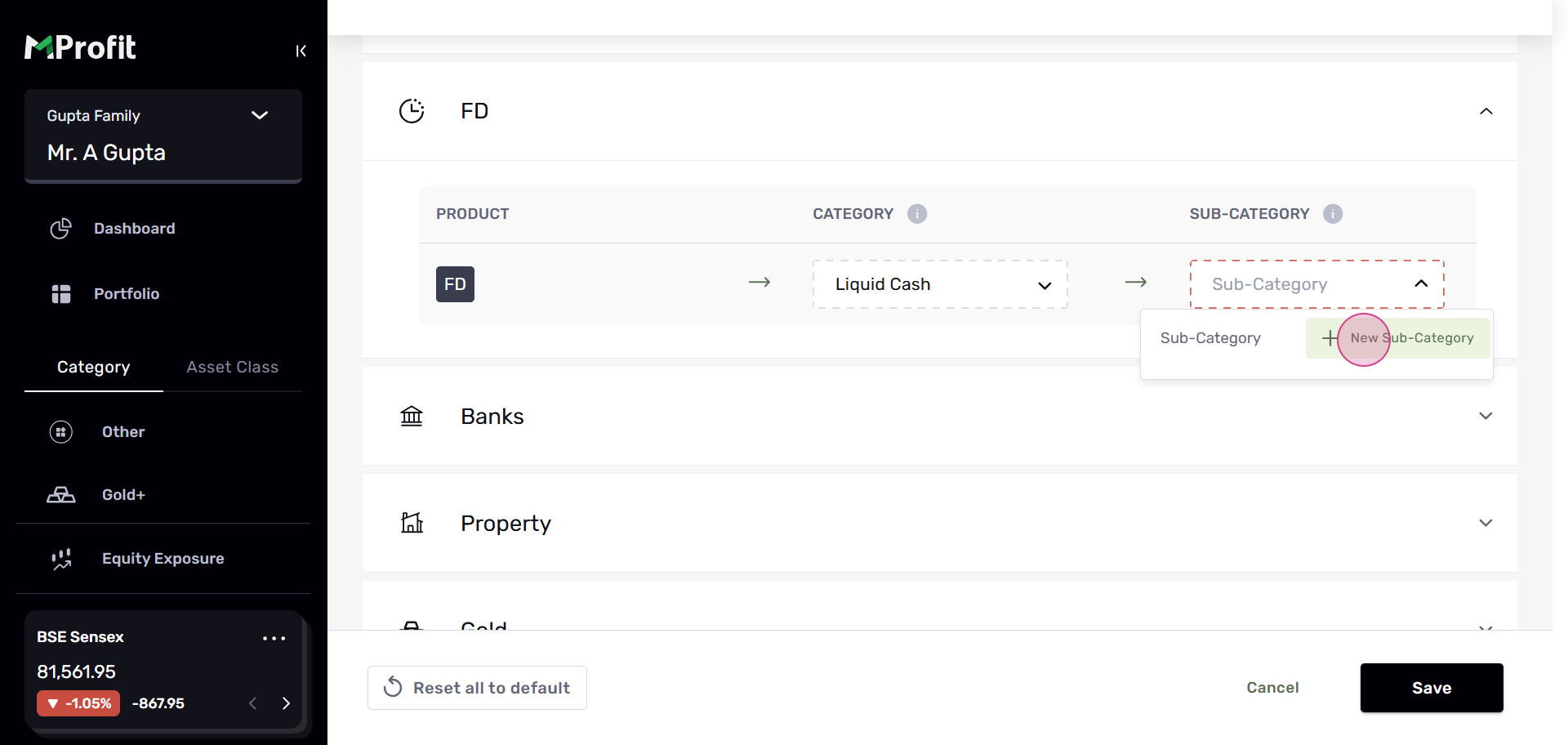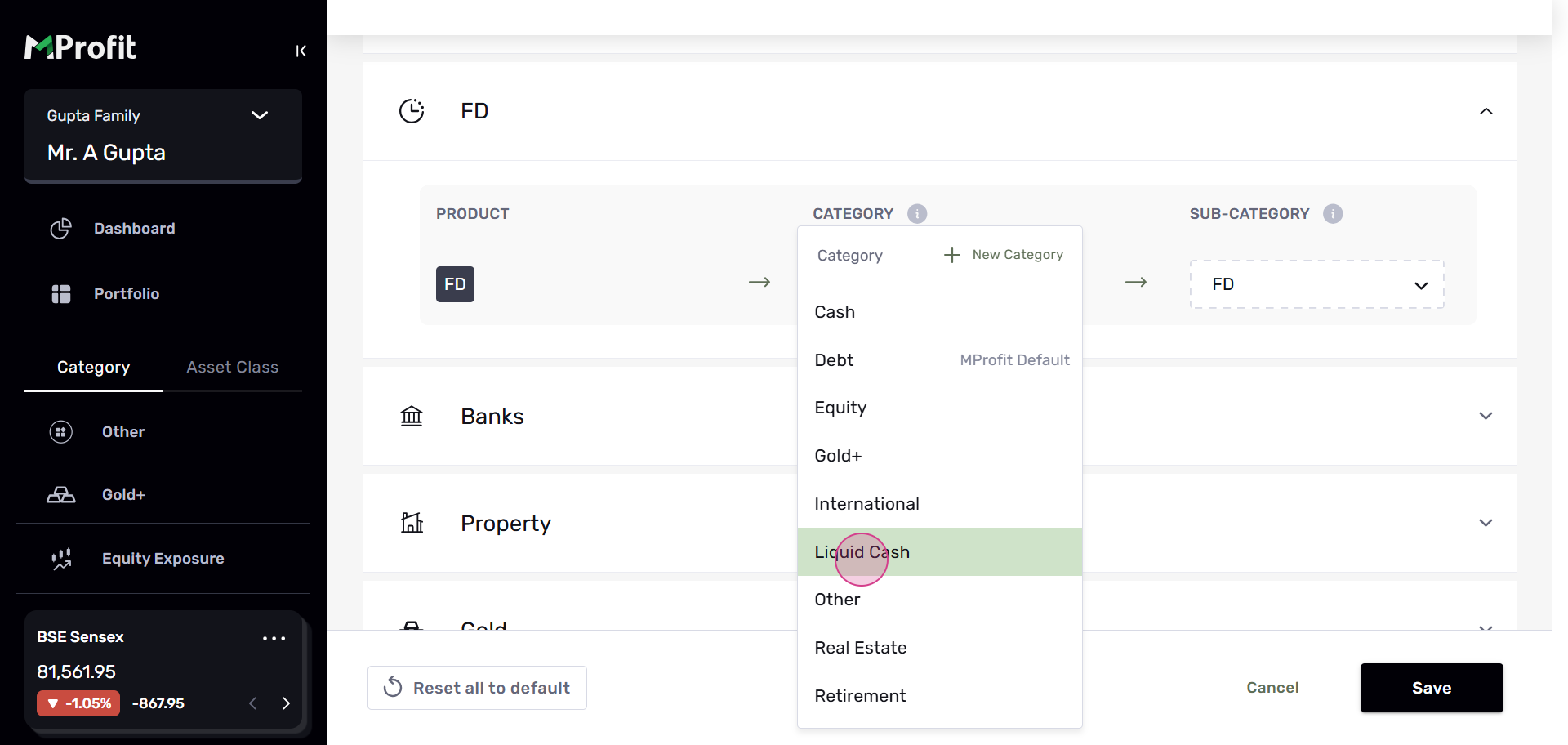 Step 4: In the Custom Categories section, you'll see assets categorized by Asset Class and by Asset. Let's use FD as an example.