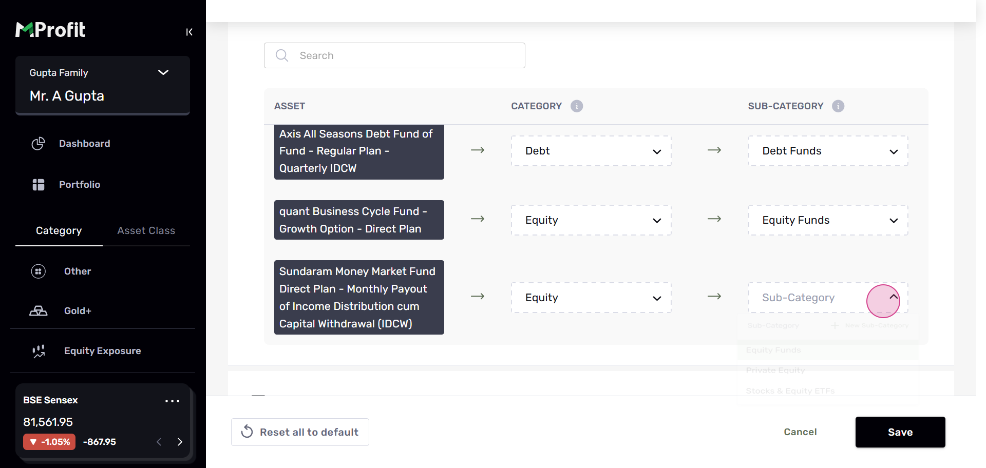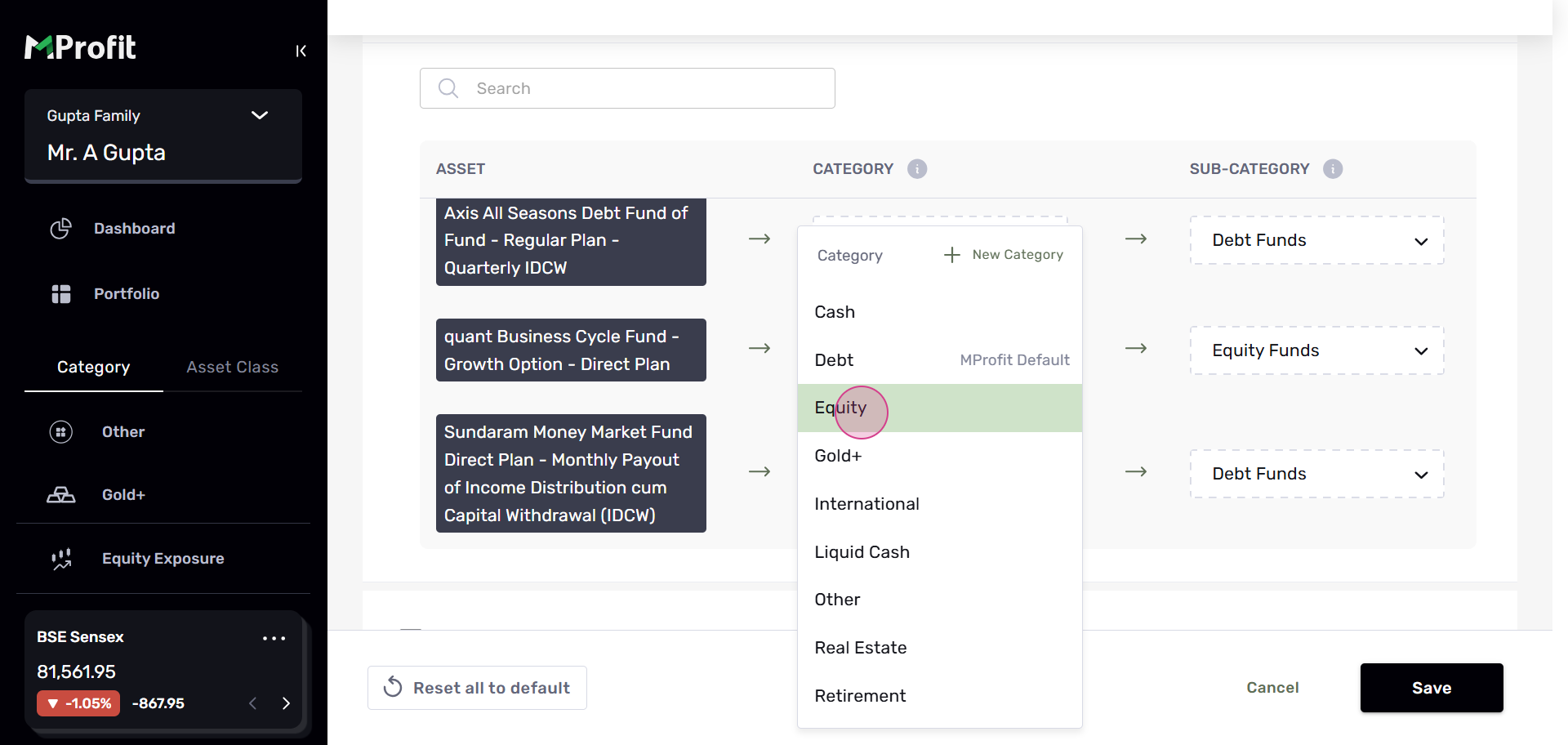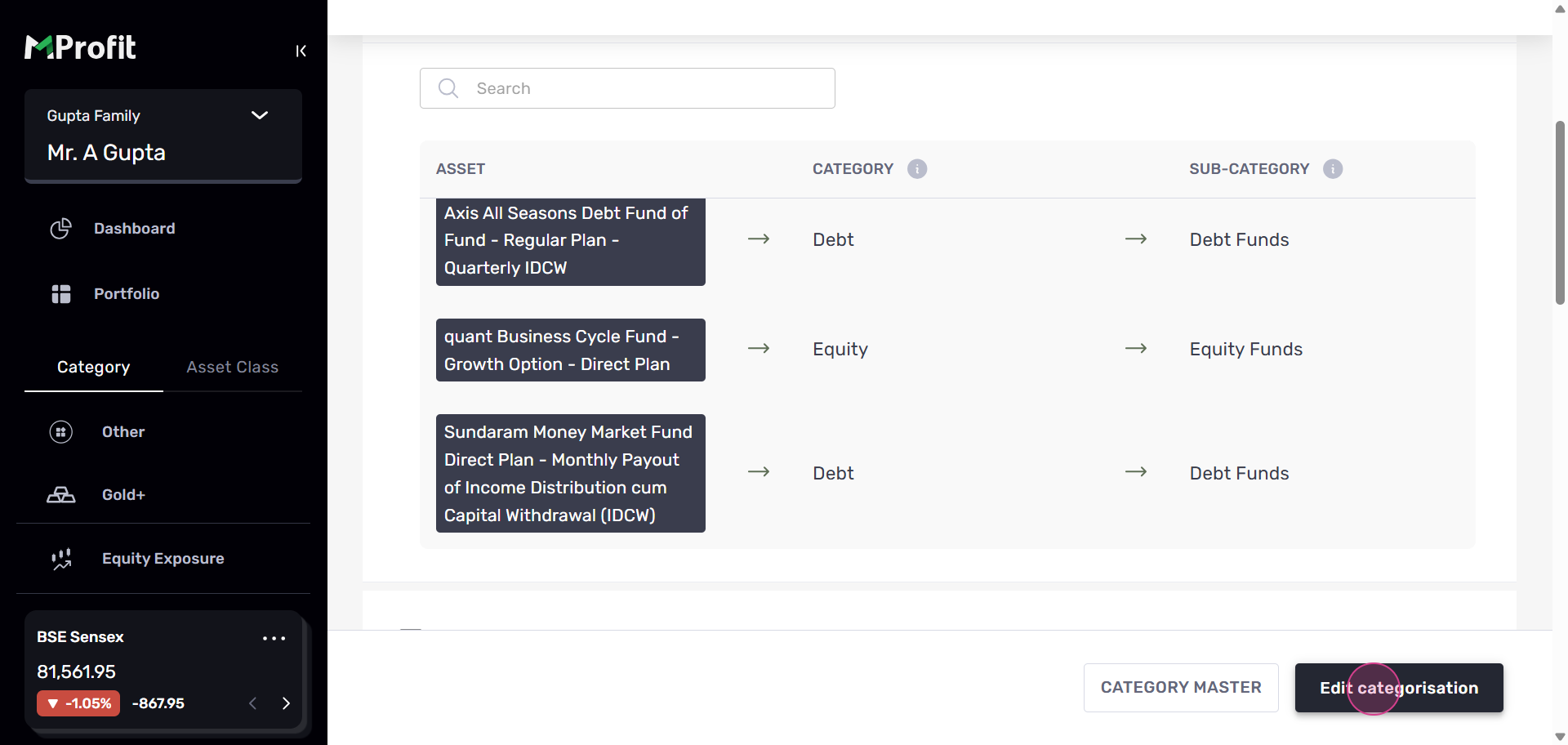 For example, to change the category of Sundaram Money Market Fund Direct Plan from Debt to Equity, follow the same process. Click Edit categorization, click on the drop-down menu, and select Equity.