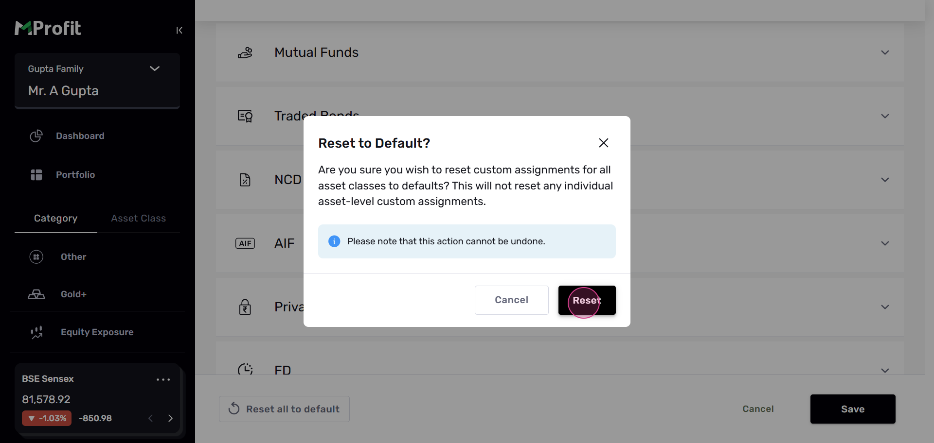 Remember, this action cannot be undone and will reset all categorizations by asset class and by asset level. If you're sure, click Reset.