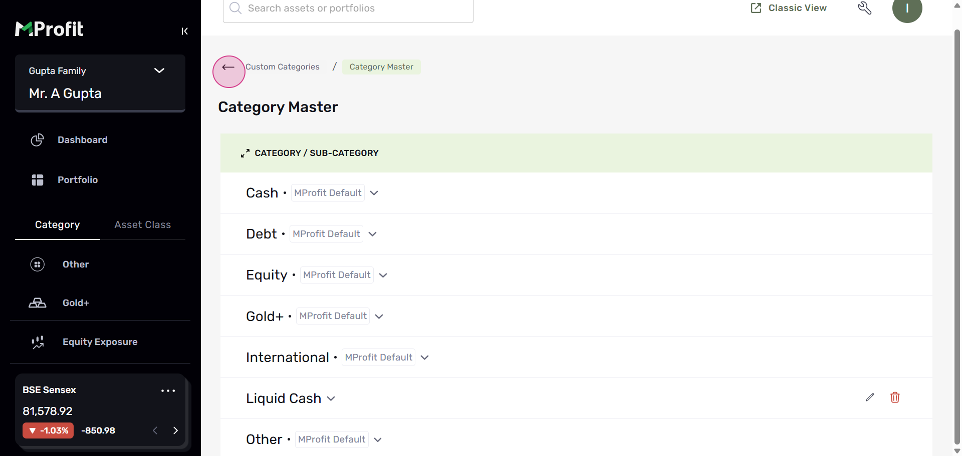 Step 16: At the bottom of the page, you'll find the Category Master, which shows all default categories created by MProfit and any new categories you've created. You can edit or delete these by clicking on the pencil or delete icons respectively.