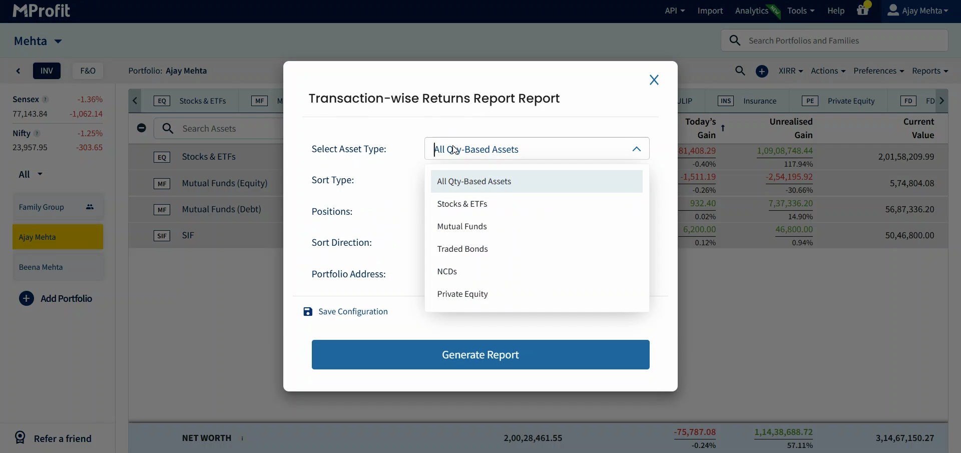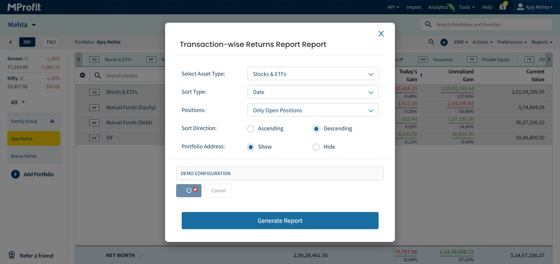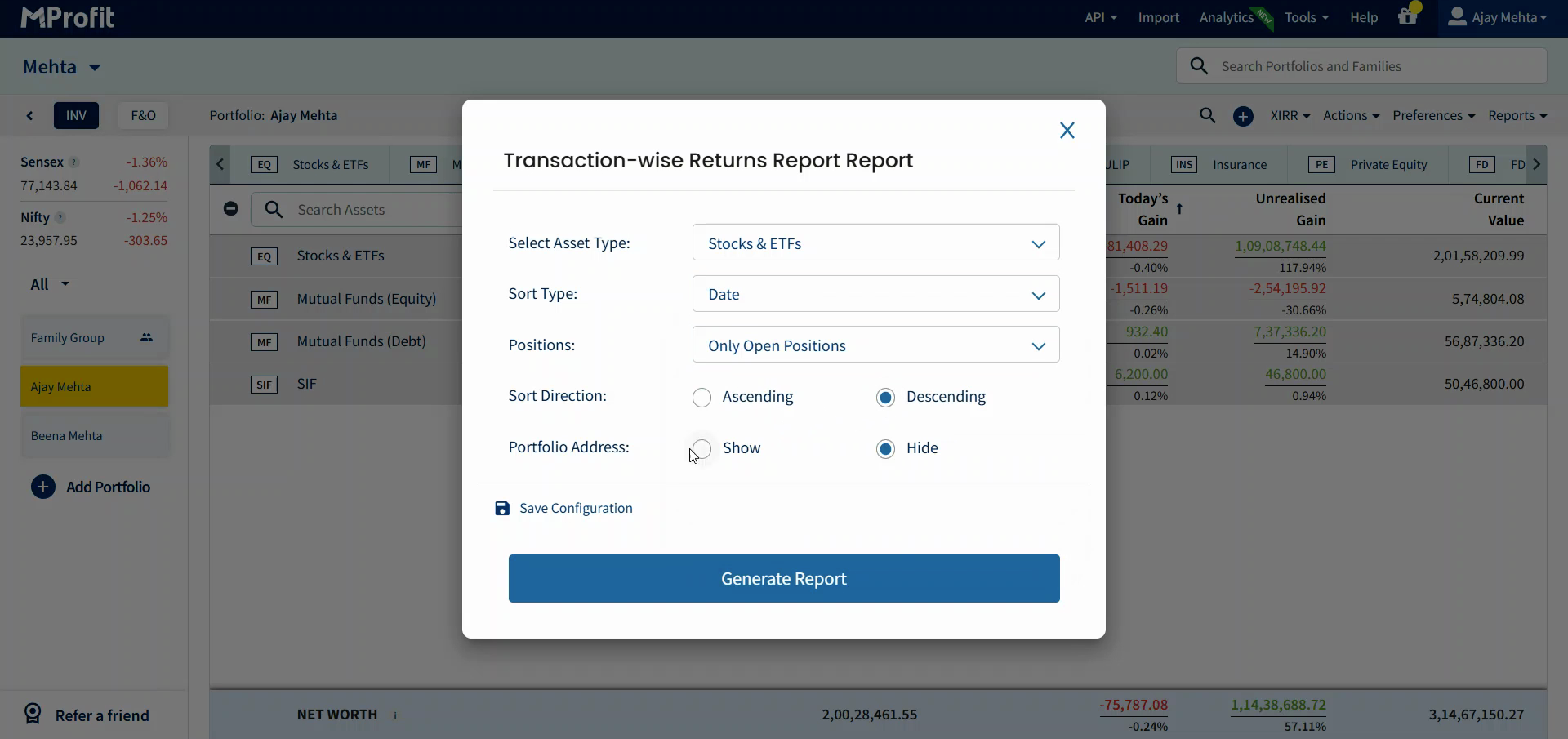 Step 3: Adjust your report filters and customisation options - change things like asset type, sort type, sort direction, or portfolio address.